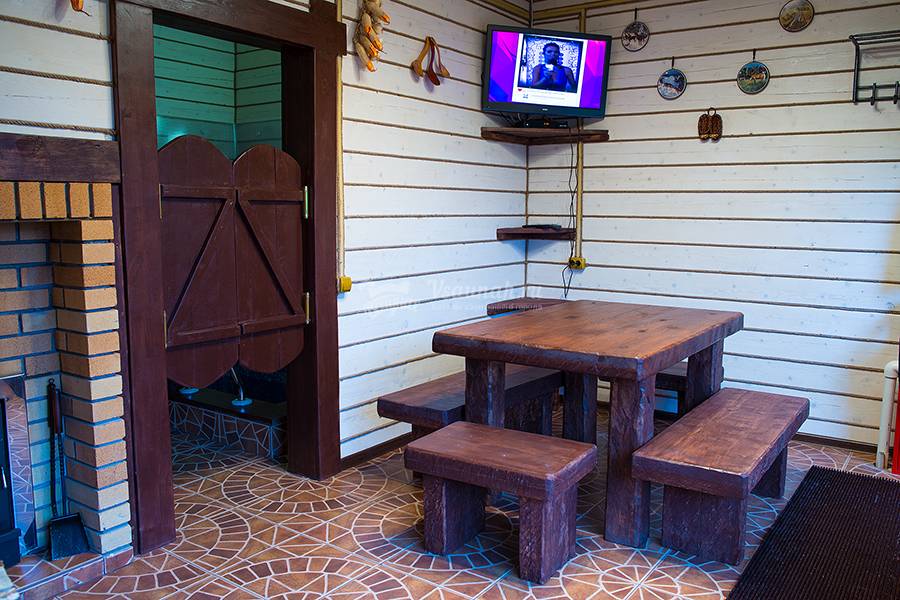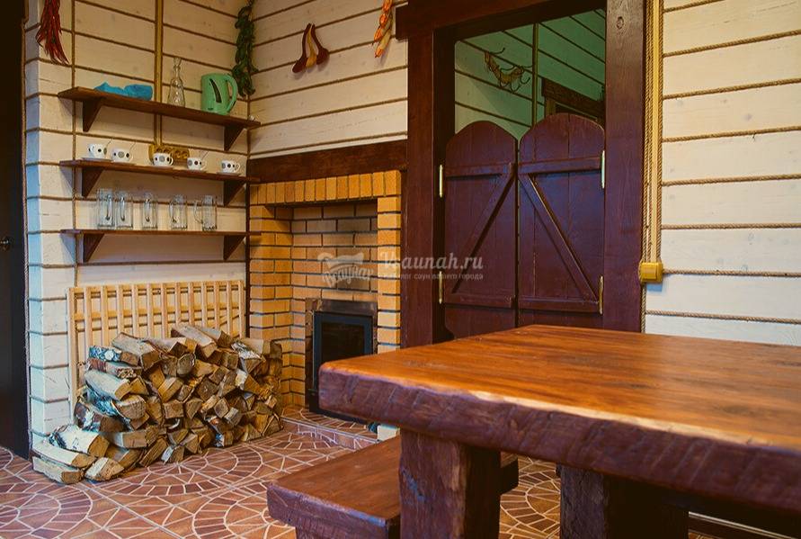 - Топим исключительно берёзовыми дровами, поэтому наша баня жаркая. Влажность внутри парной гости регулируют самостоятельно: для этого достаточно лишь плеснуть ковшом на раскалённые камни. В воду можно добавить экстракты целебных трав или аромамасла.