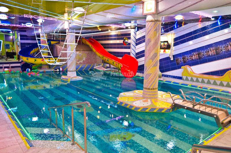 "Мини-аквапарк" , самый популярный номер среди наших гостей, рассчитанный на 25 человек, с бассейном площадью 100 кв.м. , водяные горки, тарзанки, качели и прочие развлечения на воде. Банкетный зал с камином, караоке и отдельным выходом на личную шашлычную зону. Аэрохоккей, мини-футбол, бильярд ,финская парная.